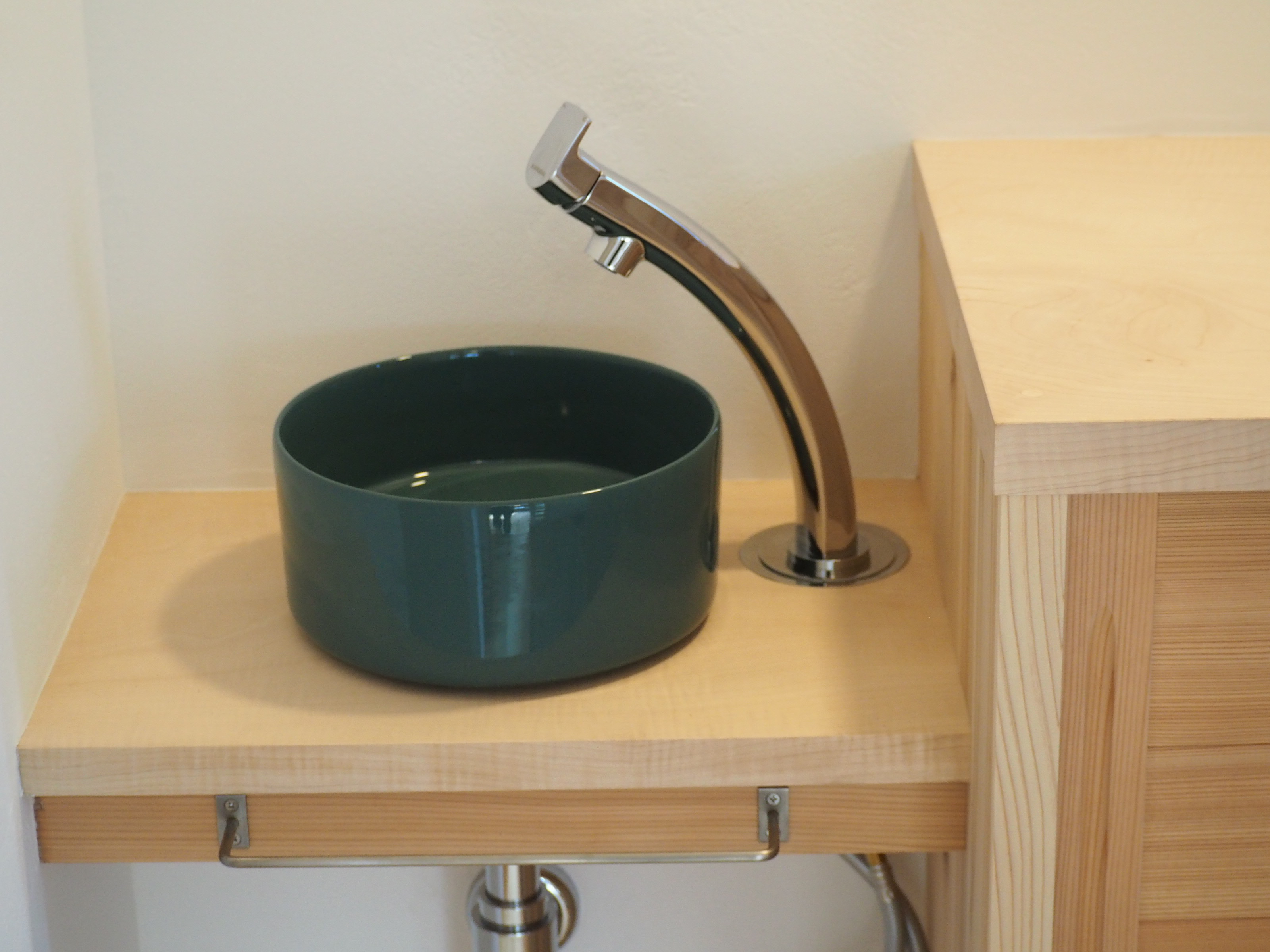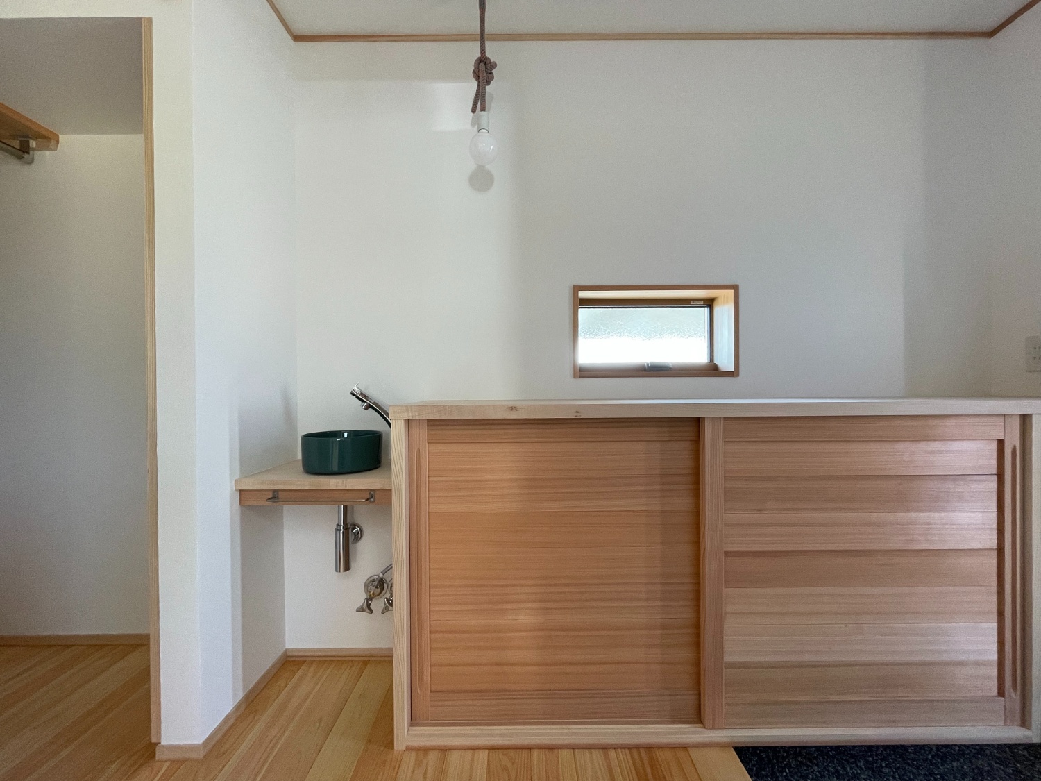 下足収納と手洗いのカウンターは同じ板を使用したかったので、限られた寸法の中でベストな加工寸法が決まりました!