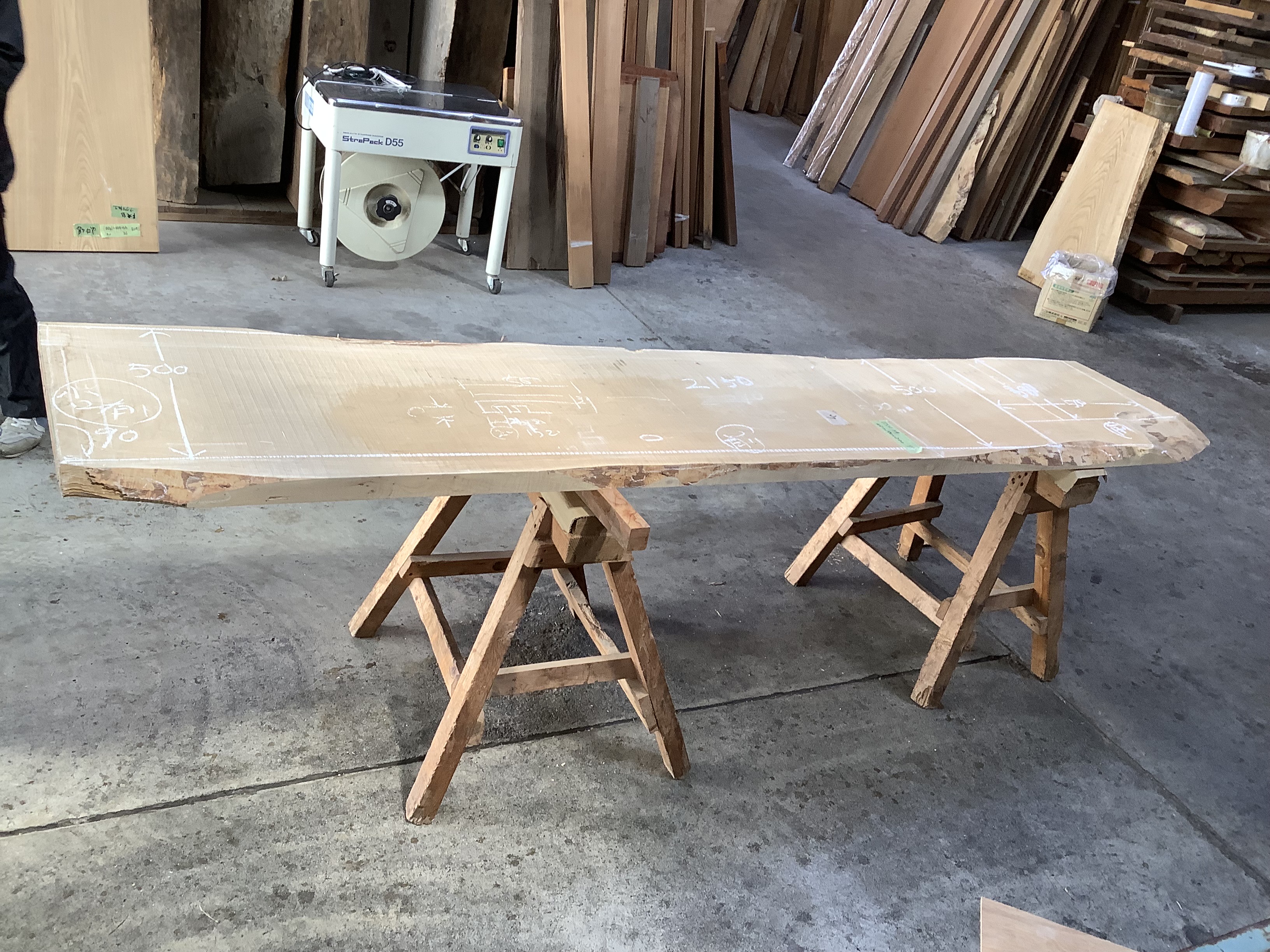 加工をお願いしている職人さんと打合せをするときには、実際に板に細かな寸法を書き入れています。(もちろん消えますよ!)