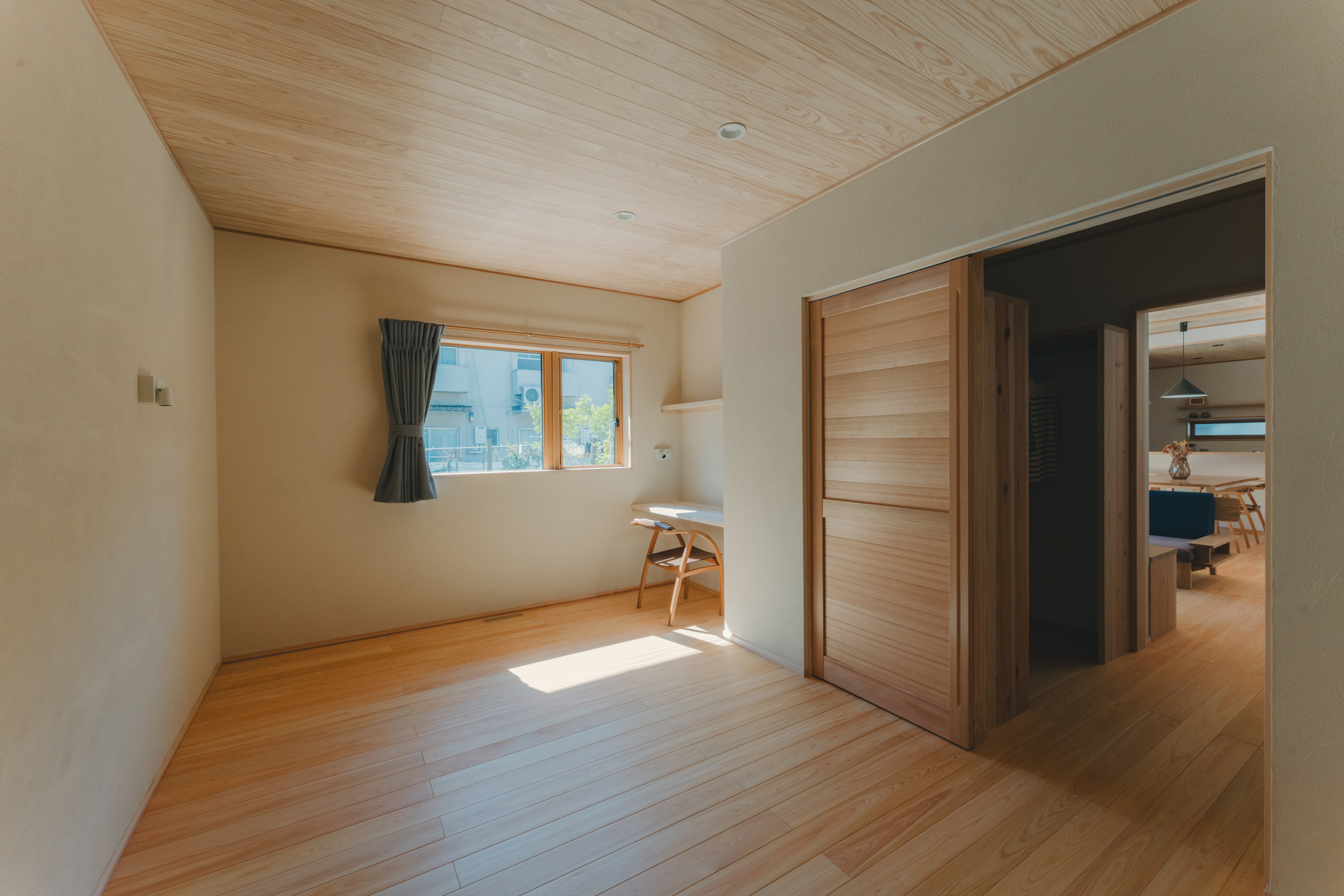 1階のメイン空間に隣接しながらも、親世帯の寝室はウォークインクローゼットを間に挟むことで、LDKの賑わいから程よく距離を置けるように設計。