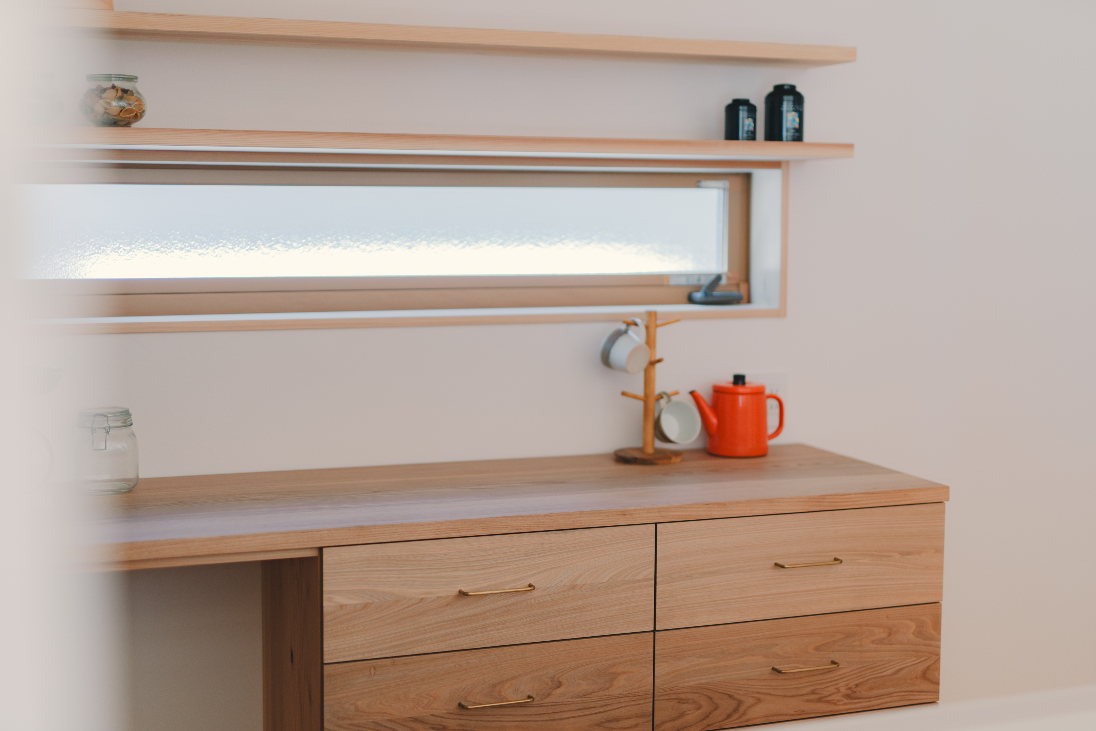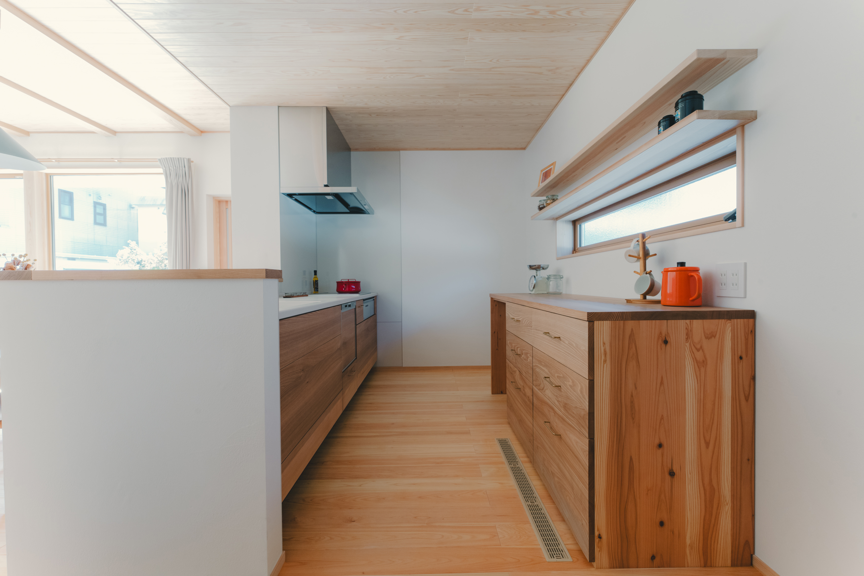 キッチンは、木の風合いを楽しめる「kigkokochi」のカップボードを採用し、キッチンの扉も無垢板に変更。