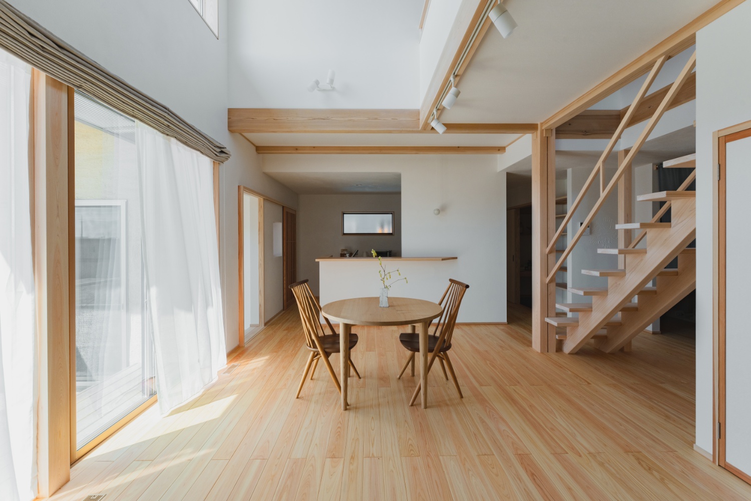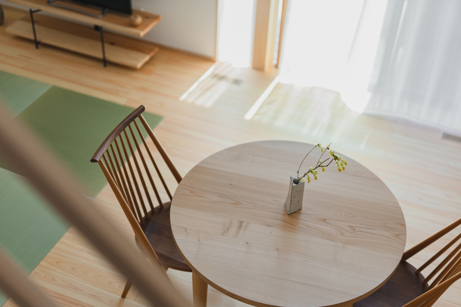 円卓を囲んで会話を楽しみ、畳コーナーでごろんとくつろぎ、ソファにもたれてテレビを見る。それぞれの過ごし方を受け止めながら、家族の距離がそっと近づく場所です。