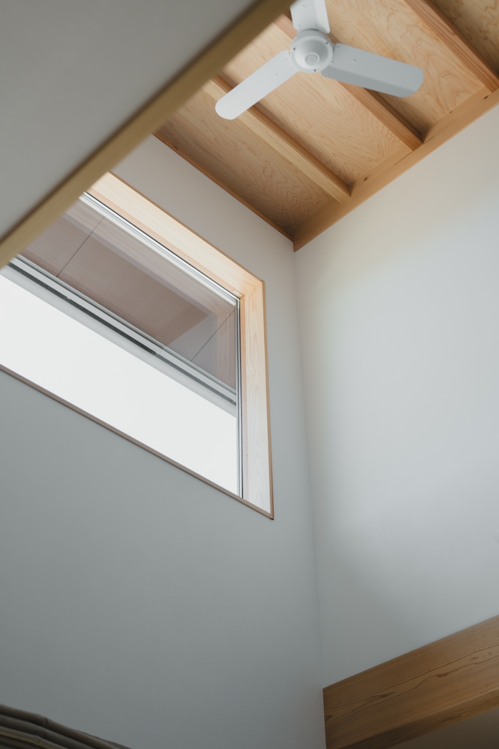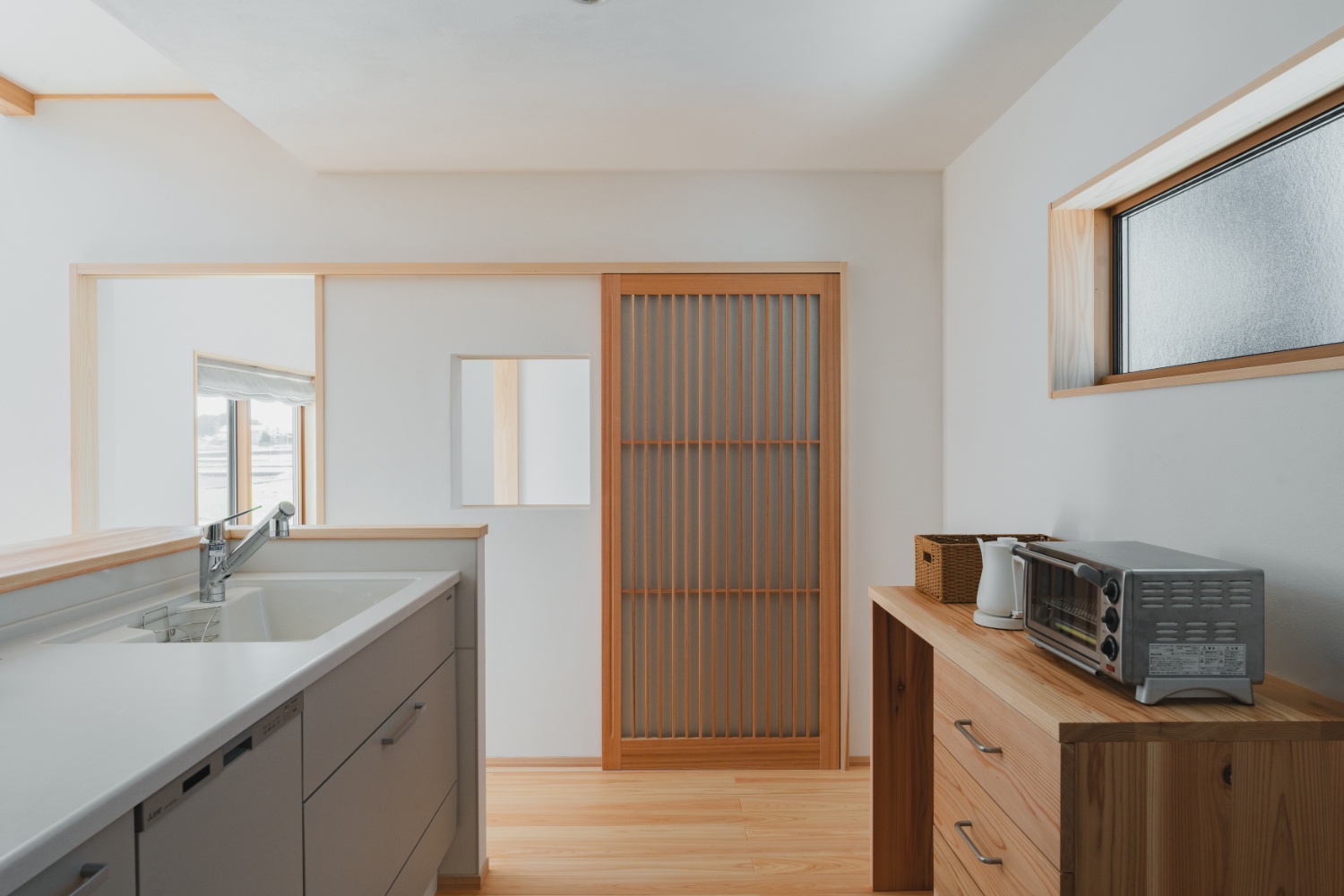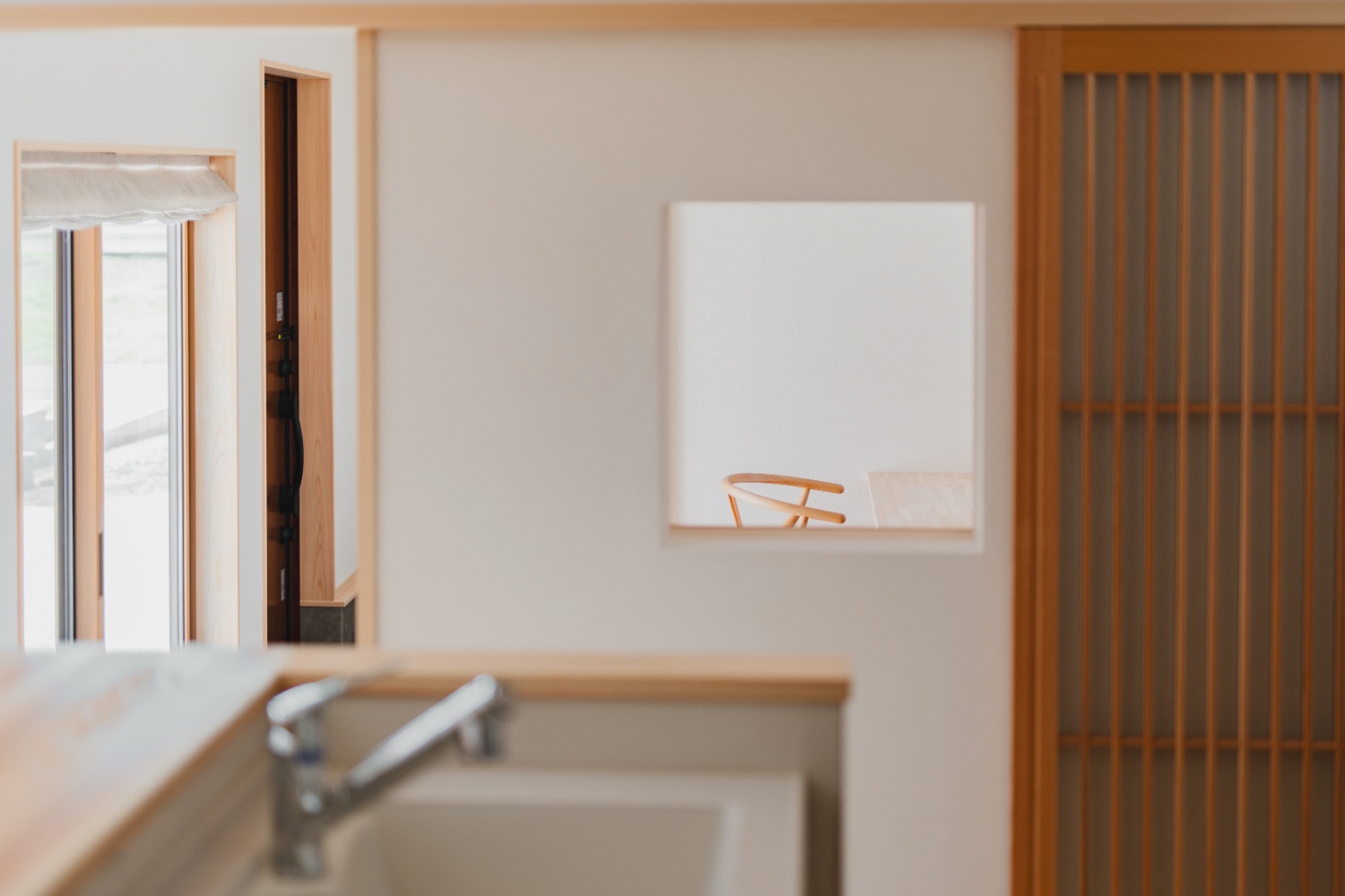 キッチンのそばには、仕事場につながる小窓の扉を設けました。